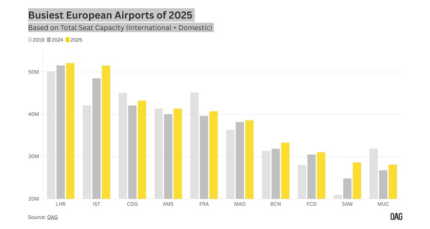 Havalimanlarını, arz edilen koltuk kapasitesi bazında derecelendiren OAG’ın “Avrupa’nın en büyük 10 havalimanı” değerlendirmesinde Sabiha Gökçen Havalimanı (SAW), 2025 yılında kapasitesini bir önceki yıla göre %15 artırarak 28,6 milyon tek yönlü (semi-route) koltuk kapasitesine ulaştı ve ilk 10 havalimanı arasında yıllık bazda en yüksek artışı kaydeden merkez oldu.