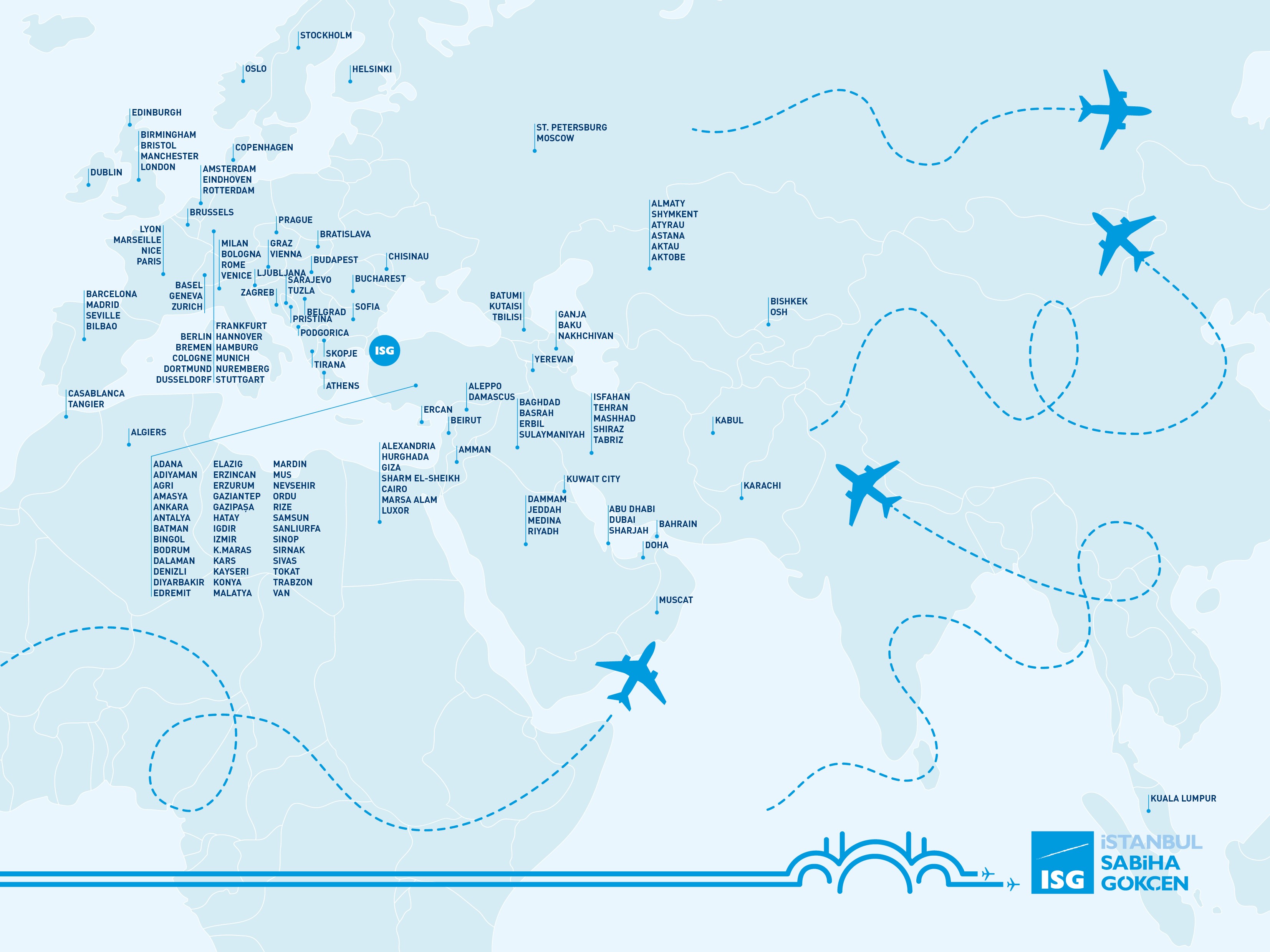 İstanbul Sabiha Gökçen Uluslararası Havalimanı’ndan tarifeli sefer gerçekleştiren havayollarının uçuş noktalarını görmek icin Uçuş Noktaları Haritası’nı inceleyebilirsiniz.