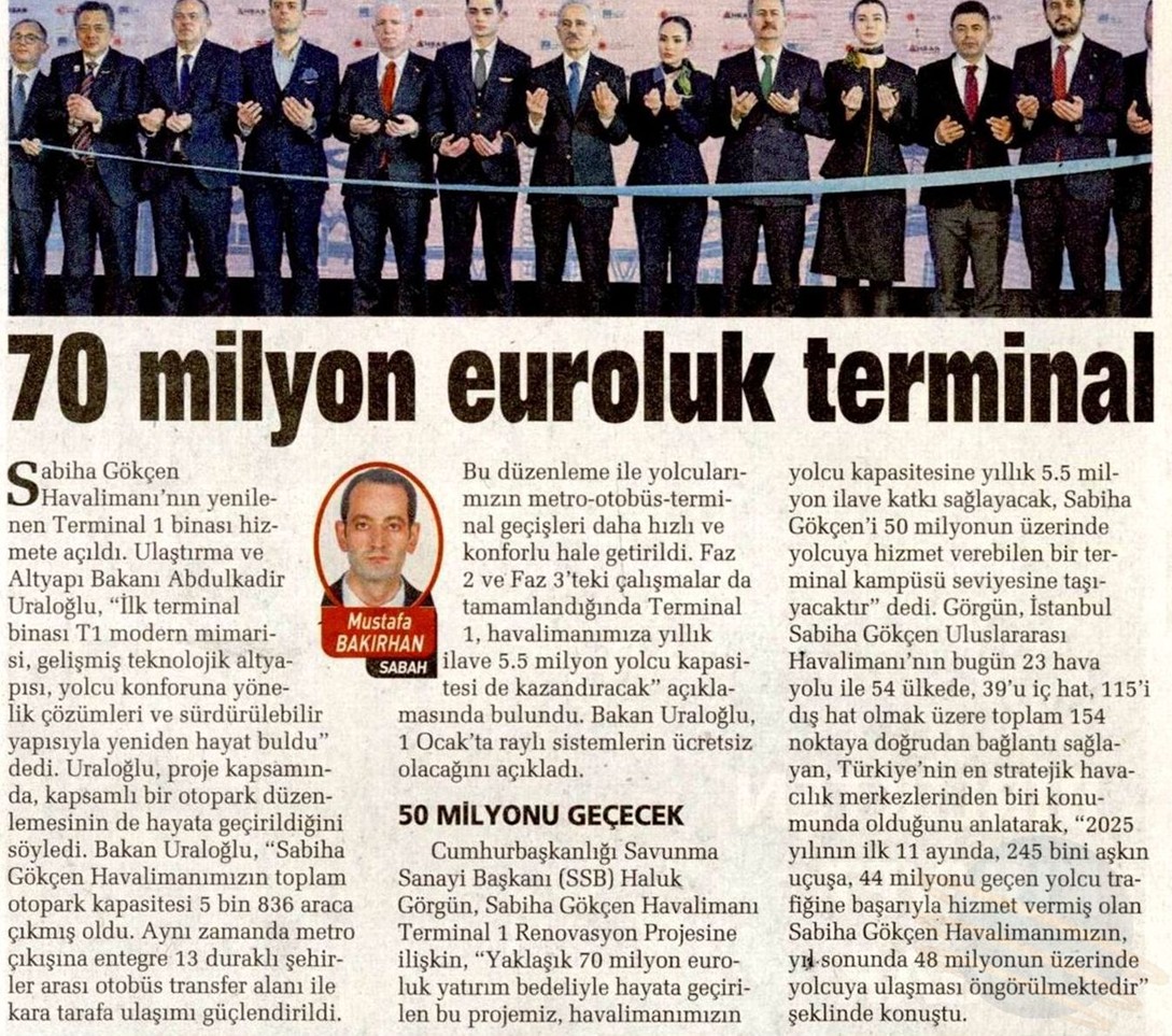 Cumhurbaşkanlığı Savunma Sanayi Başkanı (SSB) Haluk Görgün, Sabiha Gökçen Havalimanı Terminal 1 Renovasyon Projesine ilişkin, "Yaklaşık 70 milyon euroluk yatırım bedeliyle hayata geçirilen bu projemiz, havalimanımızın yolcu kapasitesine yıllık 5.5 milyon ilave katkı sağlayacak, Sabiha Gökçen’i 50 milyonun üzerinde yolcuya hizmet verebilen bir terminal kampüsü seviyesine taşıyacaktır" dedi. Görgün, İstanbul Sabiha Gökçen Uluslararası Havalimanı’nın bugün 23 hava yolu ile 54 ülkede, 39’u iç hat, 115’i dış hat olmak üzere toplam 154 noktaya doğrudan bağlantı sağlayan, Türkiye’nin en stratejik havacılık merkezlerinden biri konumunda olduğunu anlatarak, "2025 yılının ilk 11 ayında, 245 bini aşkın uçuşa, 44 milyonu geçen yolcu trafiğine başarıyla hizmet vermiş olan Sabiha Gökçen Havalimanımızın, yıl sonunda 48 milyonun üzerinde yolcuya ulaşması öngörülmektedir" şeklinde konuştu.