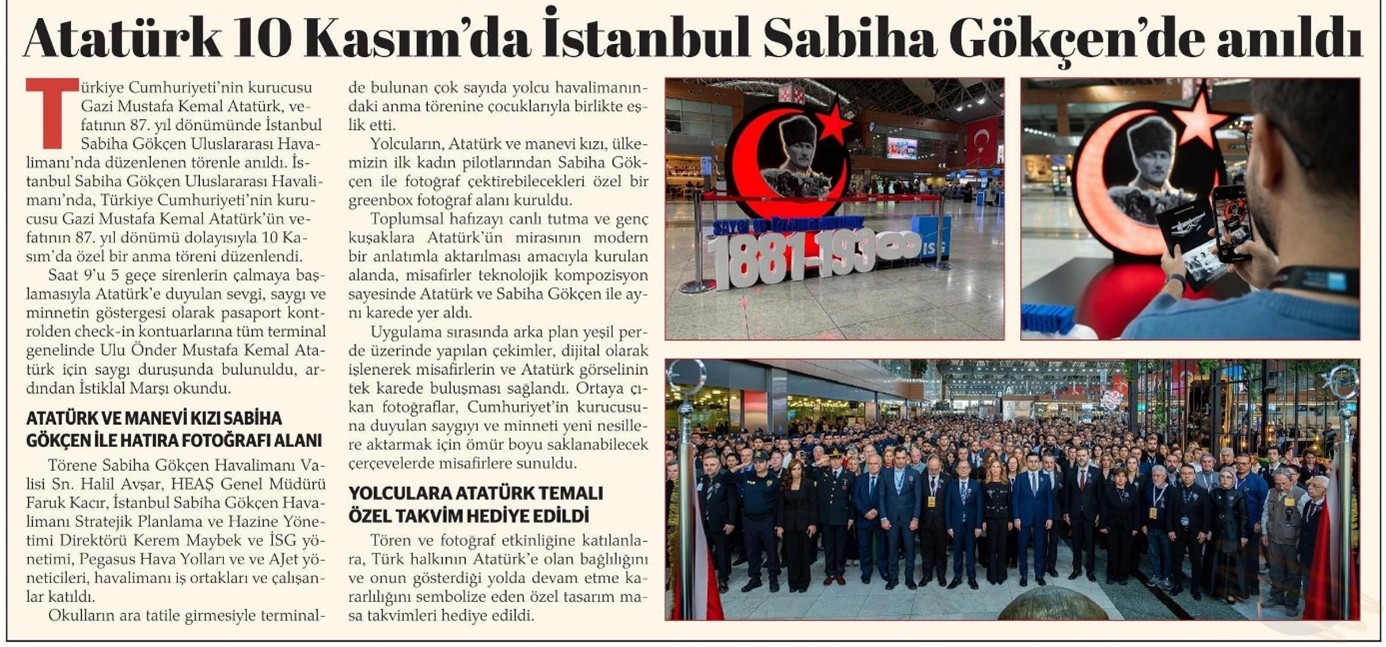 Türkiye Cumhuriyeti’nin kurucusu Gazi Mustafa Kemal Atatürk, vefatının 87. yıl dönümünde İstanbul Sabiha Gökçen Uluslararası Havalimanı’nda düzenlenen törenle anıldı. İstanbul Sabiha Gökçen Uluslararası Havalimanı’nda, Türkiye Cumhuriyeti’nin kurucusu Gazi Mustafa Kemal Atatürk’ün vefatının 87. yıl dönümü dolayısıyla 10 Kasım’da özel bir anma töreni düzenlendi.