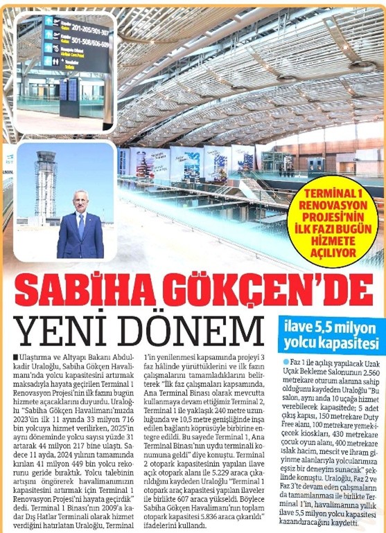 Projesi’nin ilk fazını bugün hizmete açacaklarını duyurdu. Uraloğlu "Sabiha Gökçen Havalimanımızda 2023’ün ilk 11 ayında 33
