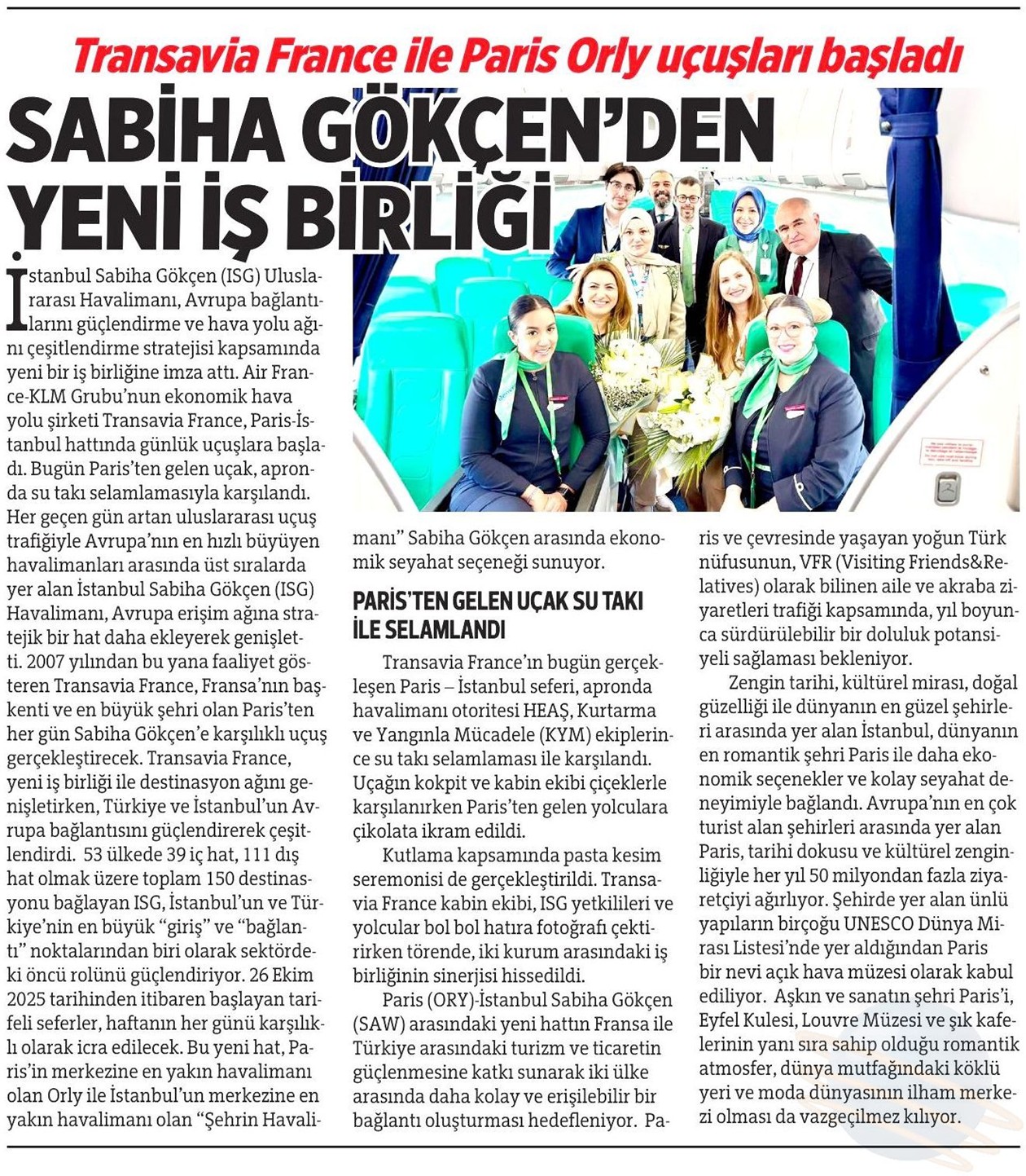 İstanbul Sabiha Gökçen (ISG) Uluslararası Havalimanı, Avrupa bağlantılarını güçlendirme ve hava yolu ağını çeşitlendirme stratejisi kapsamında yeni bir iş birliğine imza attı. Air France-KLM Grubu’nun ekonomik hava yolu şirketi Transavia France, Paris-İstanbul hattında günlük uçuşlara başladı. Bugün Paris’ten gelen uçak, apronda su takı selamlamasıyla karşılandı. Her geçen gün artan uluslararası uçuş trafiğiyle Avrupa’nın en hızlı büyüyen havalimanları arasında üst sıralarda yer alan İstanbul Sabiha Gökçen (ISG) Havalimanı, Avrupa erişim ağını stratejik bir hat daha ekleyerek genişletti. 2007 yılından bu yana faaliyet gösteren Transavia France, Fransa’nın başkenti ve en büyük şehri olan Paris’ten her gün Sabiha Gökçen’e karşılıklı uçuş gerçekleştirecek. Transavia France, yeni iş birliği ile destinasyon ağını genişletirken, Türkiye ve İstanbul’un Avrupa bağlantısını güçlendirerek çeşitlendirdi. 53 ülkede 39 iç hat, 111 dış hat olmak üzere toplam 150 destinasyonu bağlayan ISG, İstanbul’un ve Türkiye’nin en büyük "giriş" ve "bağlantı" noktalarından biri olarak sektördeki öncü rolünü güçlendiriyor. 26 Ekim 2025 tarihinden itibaren başlayan tarifeli seferler, haftanın her günü karşılıklı olarak icra edilecek. Bu yeni hat, Paris’in merkezine en yakın havalimanı olan Orly ile İstanbul’un merkezine en yakın havalimanı olan "Şehrin Havalimanı" Sabiha Gökçen arasında ekonomik seyahat seçeneği sunuyor.