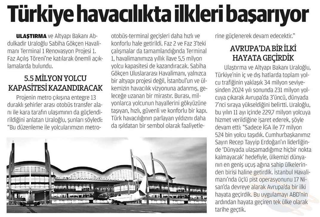 Projenin metro çıkışına entegre 13 duraklı şehirler arası otobüs transfer alanı ile kara tarafı ulaşımının da güçlendirildiğini anlatan Uraloğlu, şunları söyledi: "Bu düzenleme ile yolcularımızın metro-otobüs-terminal geçişleri daha hızlı ve konforlu hale getirildi. Faz 2 ve Faz 3’teki çalışmalar da tamamlandığında Terminal 1, havalimanımıza yıllık ilave 5,5 milyon yolcu kapasitesi de kazandıracak. Sabiha Gökçen Uluslararası Havalimanı, yalnızca bir altyapı projesi değil, İstanbul’un ve ülkemizin havacılık vizyonuna adanmış, geleceğe uzanan bir mirastır. Burası, milyonlarca yolcunun hayallerini gökyüzüne taşıyan, hızlı, güvenli ve konforlu bir kapı. Türk havacılığının parlayan yıldızını daha da ışıldatan bir sembol olarak faaliyetlerine güçlenerek devam edecektir."
