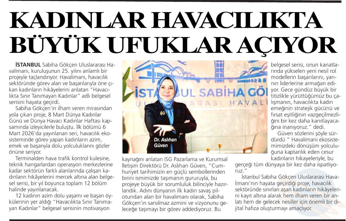 İSTANBUL Sabiha Gökçen Uluslararası Havalimanı, kuruluşunun 25. yılını anlamlı bir projeyle taçlandırıyor. Havalimanı, havacılık sektöründe görev alan ve başarılarıyla öne çıkan kadınların hikâyelerini anlatan "Havacılıkta Sınır Tanımayan Kadınlar" adlı belgesel serisini hayata geçirdi. Sabiha Gökçen’in ilham veren mirasından yola çıkan proje, 8 Mart Dünya Kadınlar Günü ve Dünya Havacı Kadınlar Haftası kapsamında izleyicilerle buluştu. İlk bölümü 6 Mart 2026’da yayınlanan seri, havacılık ekosisteminde görev yapan kadınların azim, emek ve başarıyla dolu yolculuklarını gözler önüne seriyor. Terminalden hava trafik kontrol kulesine, teknik hangarlardan operasyon merkezlerine kadar sektörün farklı alanlarında çalışan kadınların hikâyelerini mercek altına alan belgesel serisi, bir yıl boyunca toplam 12 bölüm halinde yayınlanacak. 12 kadının azim dolu yaşamı ve başarı öykülerinin yer aldığı "Havacılıkta Sınır Tanımayan Kadınlar" belgesel serisinin motivasyon kaynağını anlatan ISG Pazarlama ve Kurumsal İletişim Direktörü Dr. Aslıhan Güven, "Cumhuriyet tarihimizin en güçlü sembollerinden birini ismimizde taşımanın gururuyla, bu projeye büyük bir sorumluluk bilinciyle hazırlandık. Adını dünyanın ilk kadın savaş pilotundan alan bir havalimanı olarak, Sabiha Gökçen’in sarsılmaz azmini ve vizyonunu geleceğe taşımayı bir görev addediyoruz. Bu belgesel serisi, onun kanatlarında yükselen yeni nesil rol modellerin başarılarını, yarının liderlerine armağan ediyor. Gece gündüz büyük bir titizlikle yürüttüğümüz bu çalışmanın, havacılıkta kadın emeğinin stratejik gücünü ve fırsat eşitliğinin vazgeçilmezliğini bir kez daha kanıtlayacağına inanıyoruz." dedi. Güven sözlerini şöyle sürdürdü: "Havalimanı ekosistemimizdeki dönüşüm yolculuğuna kaptanlık eden cesur kadınların hikâyeleriyle, bu gerçeği tüm dünyaya bir kez daha ispatlıyoruz." İstanbul Sabiha Gökçen Uluslararası Havalimanı’nın hayata geçirdiği proje, havacılık sektöründe sınırları aşan kadınların hikâyelerini kayıt altına alarak hem ilham veren bir anlatı hem de gelecek nesiller için önemli bir dijital hafıza oluşturmayı amaçlıyor.