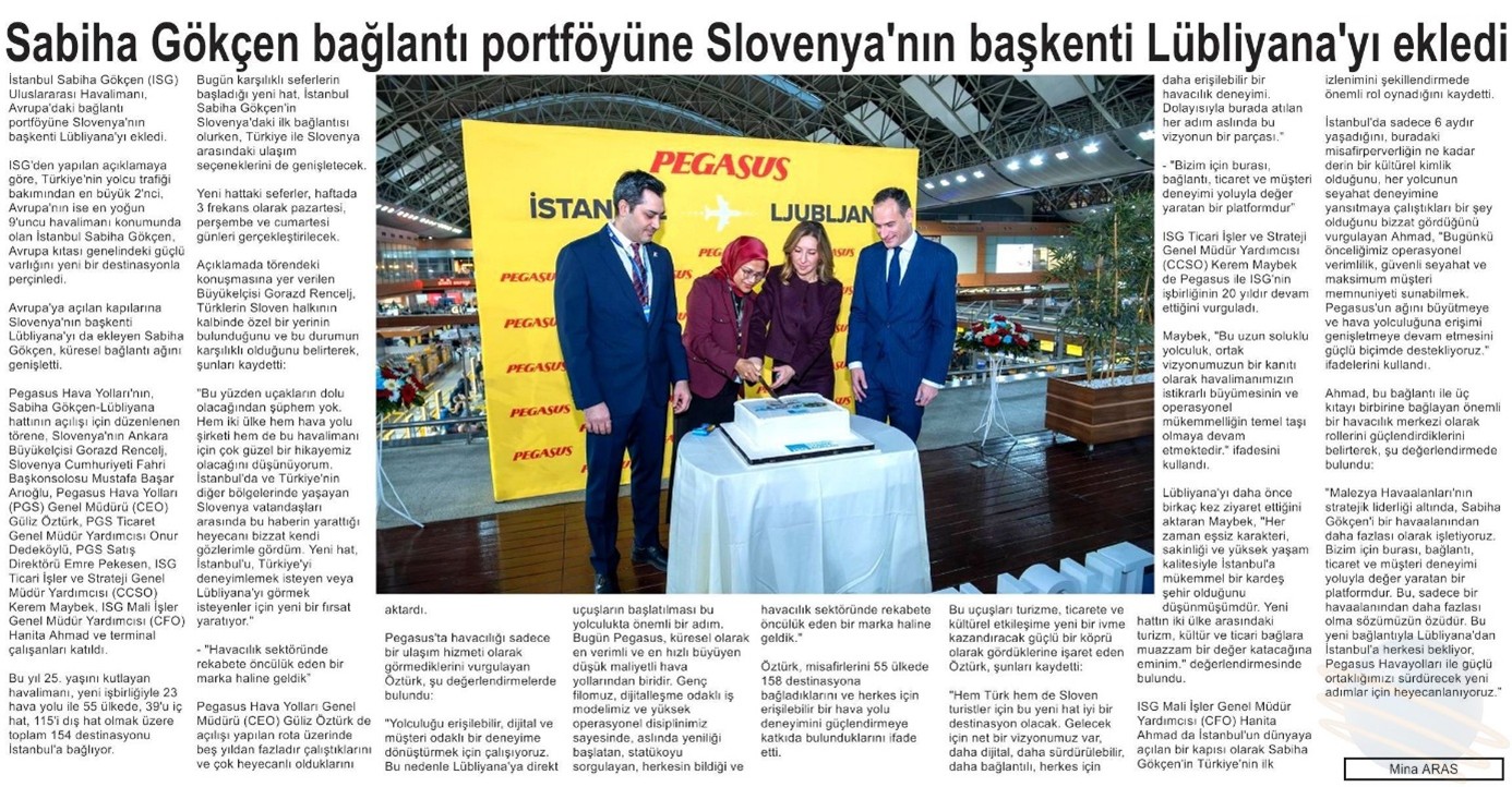 İstanbul Sabiha Gökçen (ISG) Uluslararası Havalimanı, Avrupa’daki bağlantı portföyüne Slovenya’nın başkenti Lübliyana’yı ekledi. ISG’den yapılan açıklamaya göre, Türkiye’nin yolcu trafiği bakımından en büyük 2’nci, Avrupa’nın ise en yoğun 9’uncu havalimanı konumunda olan İstanbul Sabiha Gökçen, Avrupa kıtası genelindeki güçlü varlığını yeni bir destinasyonla perçinledi. Avrupa’ya açılan kapılarına Slovenya’nın başkenti Lübliyana’yı da ekleyen Sabiha Gökçen, küresel bağlantı ağını genişletti. Pegasus Hava Yolları’nın, Sabiha Gökçen - Lübliyana hattının açılışı için düzenlenen törene, Slovenya’nın Ankara Büyükelçisi Gorazd Rencelj, Slovenya Cumhuriyeti Fahri Başkonsolosu Mustafa Başar Arıoğlu, Pegasus Hava Yolları (PGS) Genel Müdürü (CEO) Güliz Öztürk, PGS Ticaret Genel Müdür Yardımcısı Onur Dedeköylü, PGS Satış Direktörü Emre Pekesen, ISG Ticari İşler ve Strateji Genel Müdür Yardımcısı (CCSO) Kerem Maybek, ISG Mali işler Genel Müdür Yardımcısı (CFO) Hanita Ahmad ve terminal çalışanları katıldı. Bu yıl 25. yaşını kutlayan havalimanı, yeni işbirliğiyle 23 hava yolu ile 55 ülkede, 39’u iç hat, 115’i dış hat olmak üzere toplam 154 destinasyonu İstanbul’a bağlıyor. Bugün karşılıklı seferlerin başladığı yeni hat, İstanbul Sabiha Gökçen’in Slovenya’daki ilk bağlantısı olurken, Türkiye ile Slovenya arasındaki ulaşım seçeneklerini de genişletecek. Yeni hattaki seferler, haftada 3 frekans olarak Pazartesi, Perşembe ve Cumartesi günleri gerçekleştirilecek. Açıklamada törendeki konuşmasına yer verilen Büyükelçi Gorazd Rencelj, Türklerin Sloven halkının kalbinde özel bir yerinin bulunduğunu ve bu durumun karşılıklı olduğunu belirterek, şunları kaydetti: